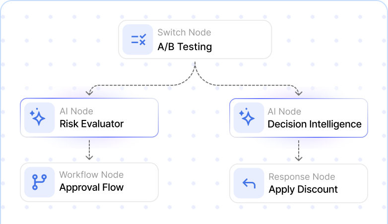 Run A/B tests and simulations on your decision flows before deployment. Compare outcomes, evaluate rule performance, and optimize continuously with live data feedback.