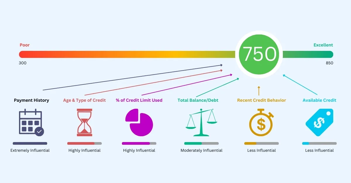 Types of Credit in Use: A mix of different types of credit accounts (e.g., credit cards, loans) that can demonstrate versatility in handling credit.
