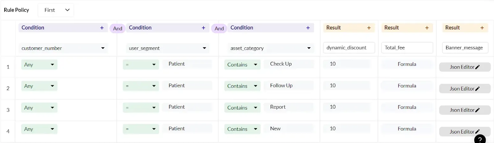 The above image shows a combination of conditions that needs to qualify for billing. Any customer number who is a patient if comes for either check up, follow up, report is getting a discount. There must be a database where new customers are registered and that database gets integrated with Nected . So manual intervention is not possible that omits the chances of fraud.