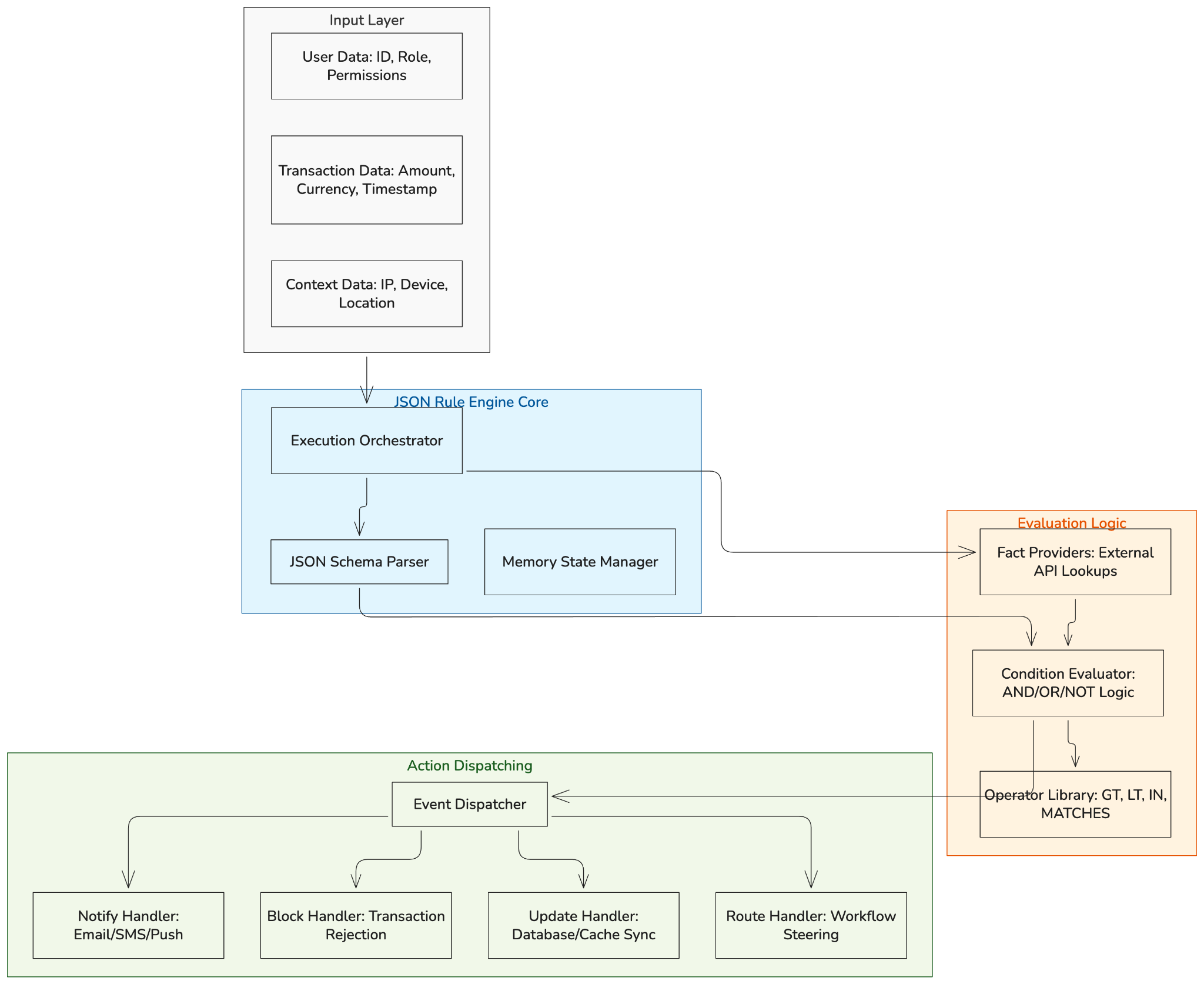 At its core, a JSON rules engine is a runtime evaluator for JSON decision models. You give it a set of rules and a set of facts. It evaluates each rule against the facts and fires events when conditions are met.