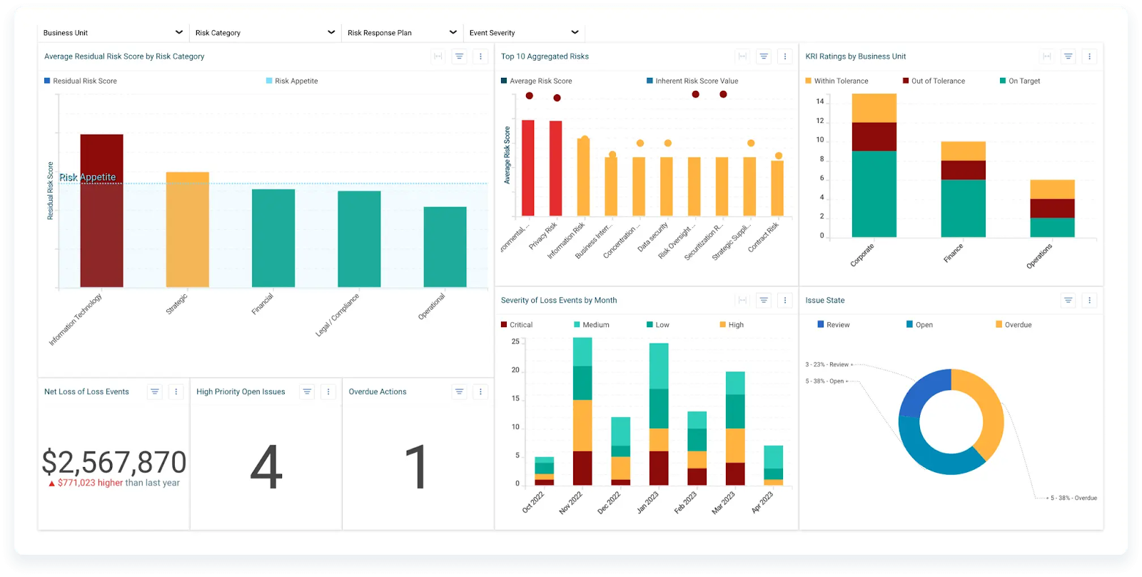 - Reporting dashboards — giving teams a quick view of risk trends, open issues, and overdue actions.