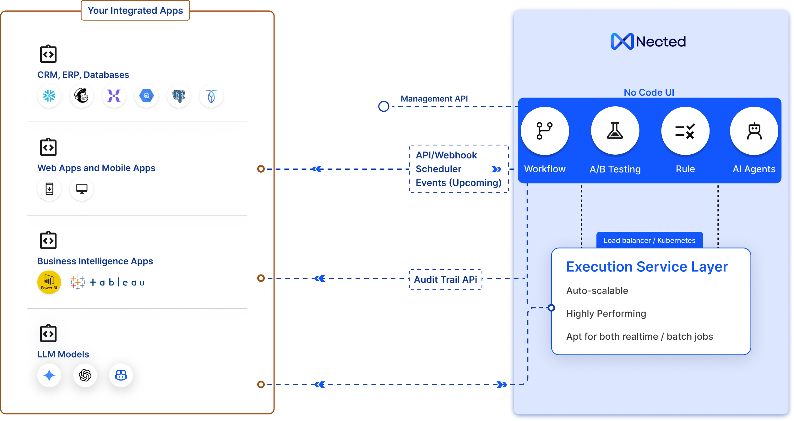 Connect any custom or pre-trained AI model. Nected supports OpenAI, Anthropic, Gemini, Vertex AI, Claude, and custom ML endpointsâallowing you to decide how and when AI powers your automation.