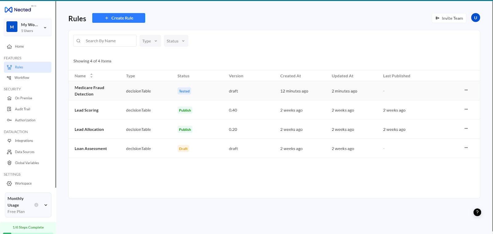 1. Low-code/no-code rule engine: Nected's platform allows non-technicals to create and modify rules and workflows with ease, reducing the need for specialized technical expertise
