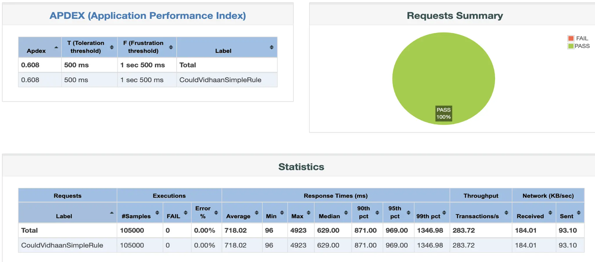 - Methodology: Conducted with JMeter using 275 threads, limiting throughput to 17,000 per minute. A total of 1 lakh requests were executed.