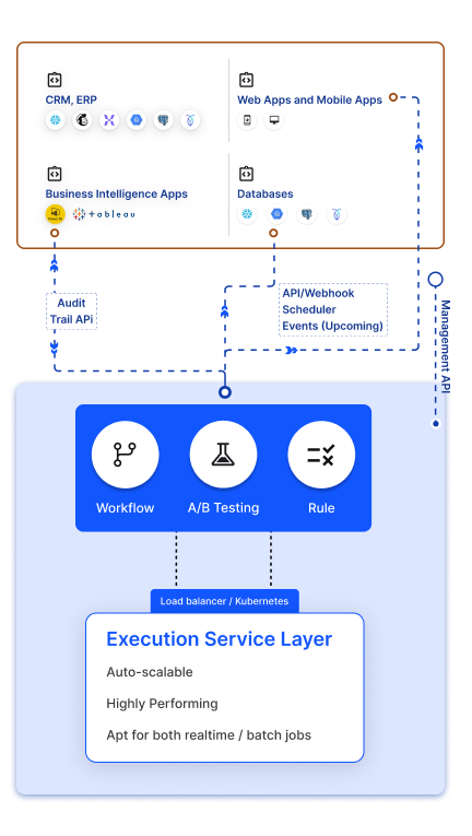 Yes — built for enterprise throughput and reliability. Nected supports horizontal scaling, backpressure handling, and SLA-backed uptime. Run thousands of concurrent scoring requests with millisecond decision latency and predictable performance; proven to scale to 100k decisions/min in production architectures.